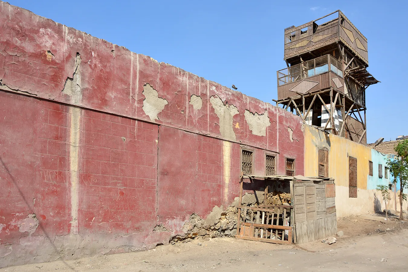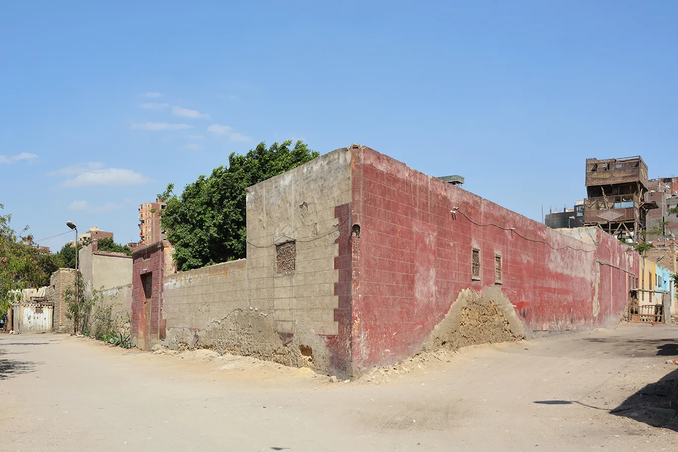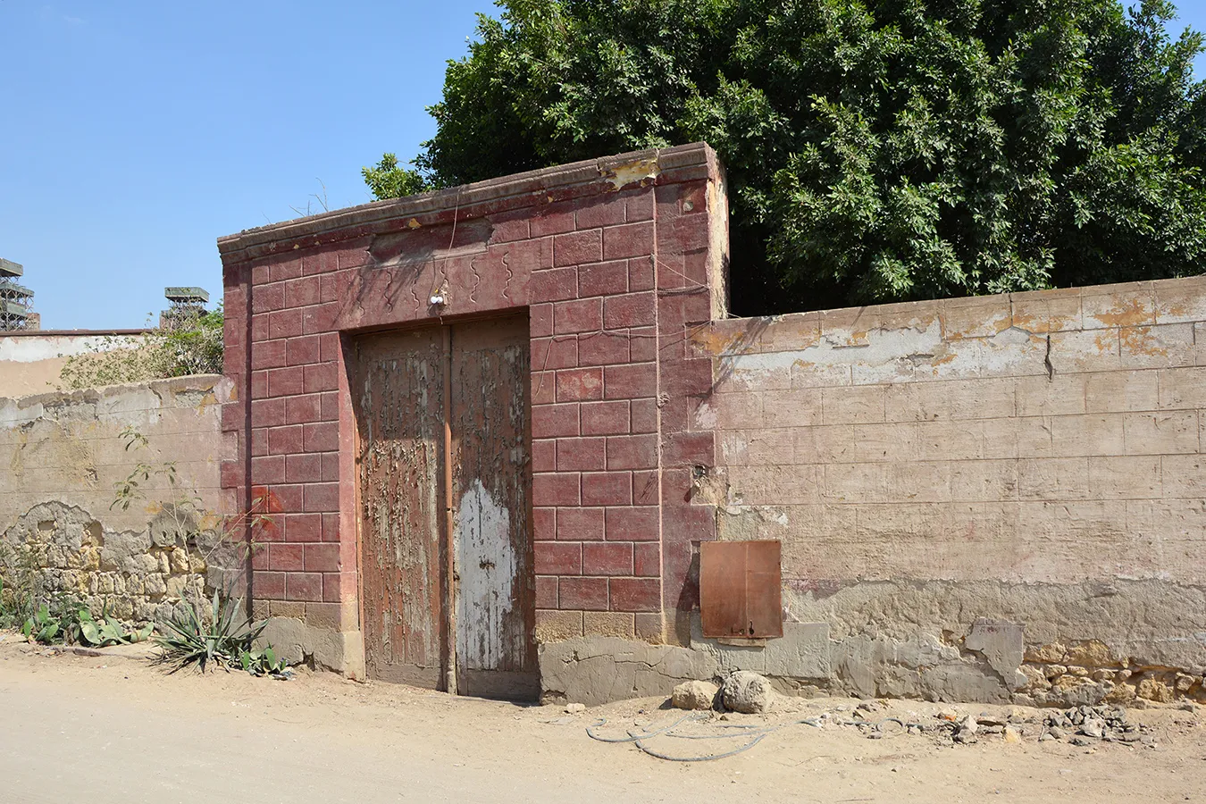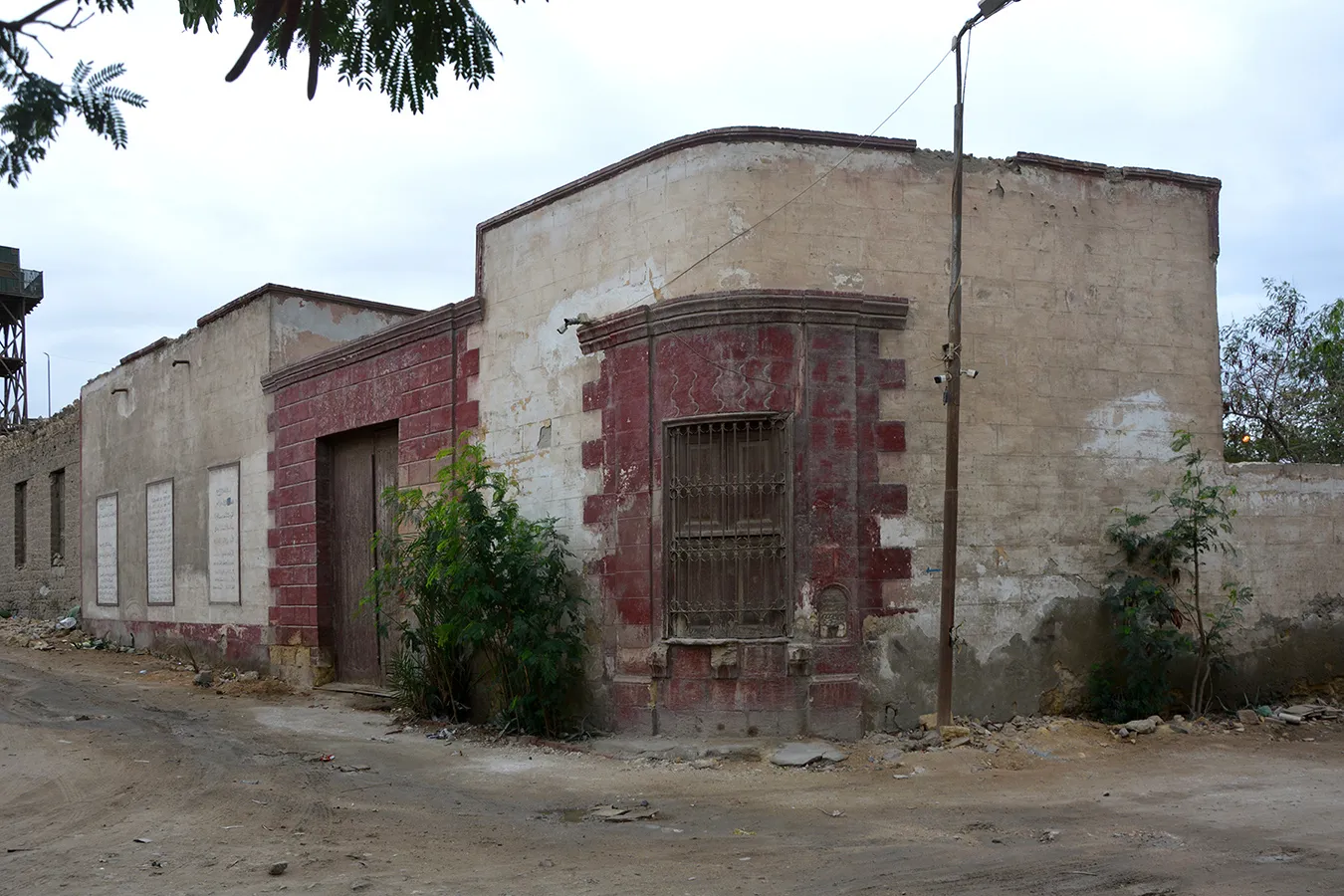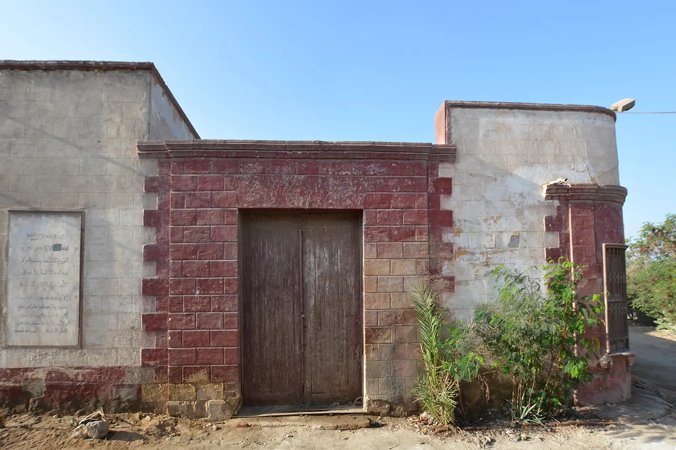 The funerary enclosure occupies a sizeable quadrilateral lot measuring approximately 32 x 20–40 metres, with southern, eastern and northern walls meeting at right angles, and the western wall oblique. It faces streets on the southern, western and northern sides, and borders on neighbouring funerary enclosure to the east. The corner where the western and northern walls meet at an obtuse angle is rounded and pierced with a large sabil window. It is rectangular, covered with a flat arch of joggled voussoirs, and flanked with two very simple pilasters carrying a simple Classical moulding. There are two similarly treated gates in the northern and western walls (the western one taller than the western wall, which is much lower than the buildings in the corners of the enclosure. Otherwise, there is no architectural decoration; the building hasn’t got a formally arranged façade. The sabil window had a marble ledge at the bottom supported on three muqarnas corbels. Only scarce remnants remain. The corbels, the joggled voussoirs, and an empty recess over the western gate are the only elements of the building related to Mamluk style. Right of the sabil window is a small wall fountain with a bronze spigot in a marble wall panel with rounded top that is set in a recess framed with simple moulding. The panel contains three lines of calligraphic inscription in raised relief. The text relates to the beneficence of water and includes the date 17 Gumada al-Thani 1333 AH. The windows in the southern elevation are rectangular, small and plain. There are clear traces of at least three large openings in the wall that have been walled up. The windows (including the sabil window) are fitted with simple decorative wrought iron grilles. The northern elevation is windowless. On the wall of the building in the north-eastern corner three huge panels in wooden frames are mounted (apparently later than the original construction.) They include hand-painted religious inscriptions in a trained, but not masterly hand.