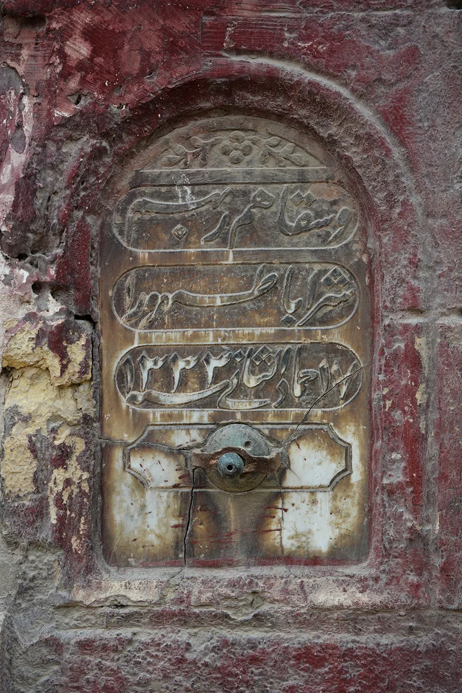 The date 17 Gumada al-Thani 1333 AH written on the marble wall-fountain on the wall corresponds to 1 May AD 1915.
