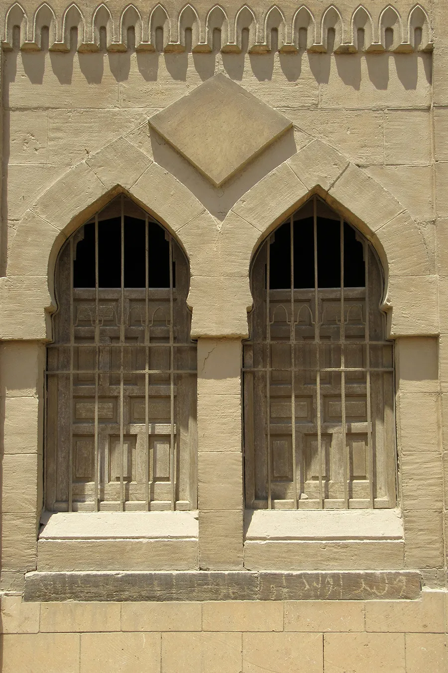 A small roughly rectangular enclosure measuring approximately 17 x 9 metres. It borders on a street to the east, on neighbouring funerary enclosures to northern and southern sides, and on the embankment of the Salah Salem motorway to the back (west). A single-storey structure on an L-shaped plan occupies the eastern part of the lot. The main (eastern) façade is strictly symmetrical, divided into three bays slightly recessed between plain flat projections and topped with a simplified muqarnas frieze. The portion of the façade over the central bay containing the entrance gate is higher, forming a step framed in moulding continuous with cornice, with scalloped quarter-circle ornaments to the sides. In the taller section is an empty recess framed in mouldings like Mamluk-style placement for an inscription panel. The entrance gate and double windows placed in side bays are covered with keel arches of horseshoe profiles that are framed in un-moulded flat projections, which rhombus-shaped projections over the twin windows. It is not clear whether the extreme simplification of opening’s decoration results from modernist aesthetics prevailing at the time of construction, or the planned mouldings were never carved. However, some other elements are finished with fine carving, so it appears that the latter was the case. In the doors and windows are extremely simple openwork grilles of pieces of rolled steel. The windows are fitted with simple panelled wooden shutters with openings of simplified decorative outline above. The entrance leads to an arcade opening on the small back courtyard with arches similar to those in the front façade. To the left (south is the entrance to a room, and further to the west, on the southern side of the courtyard, is another room opening onto the courtyard with two arches.
