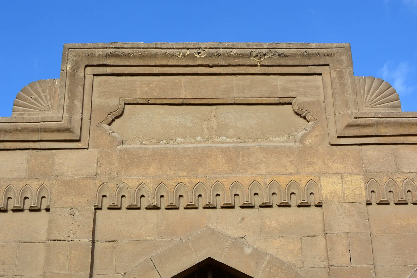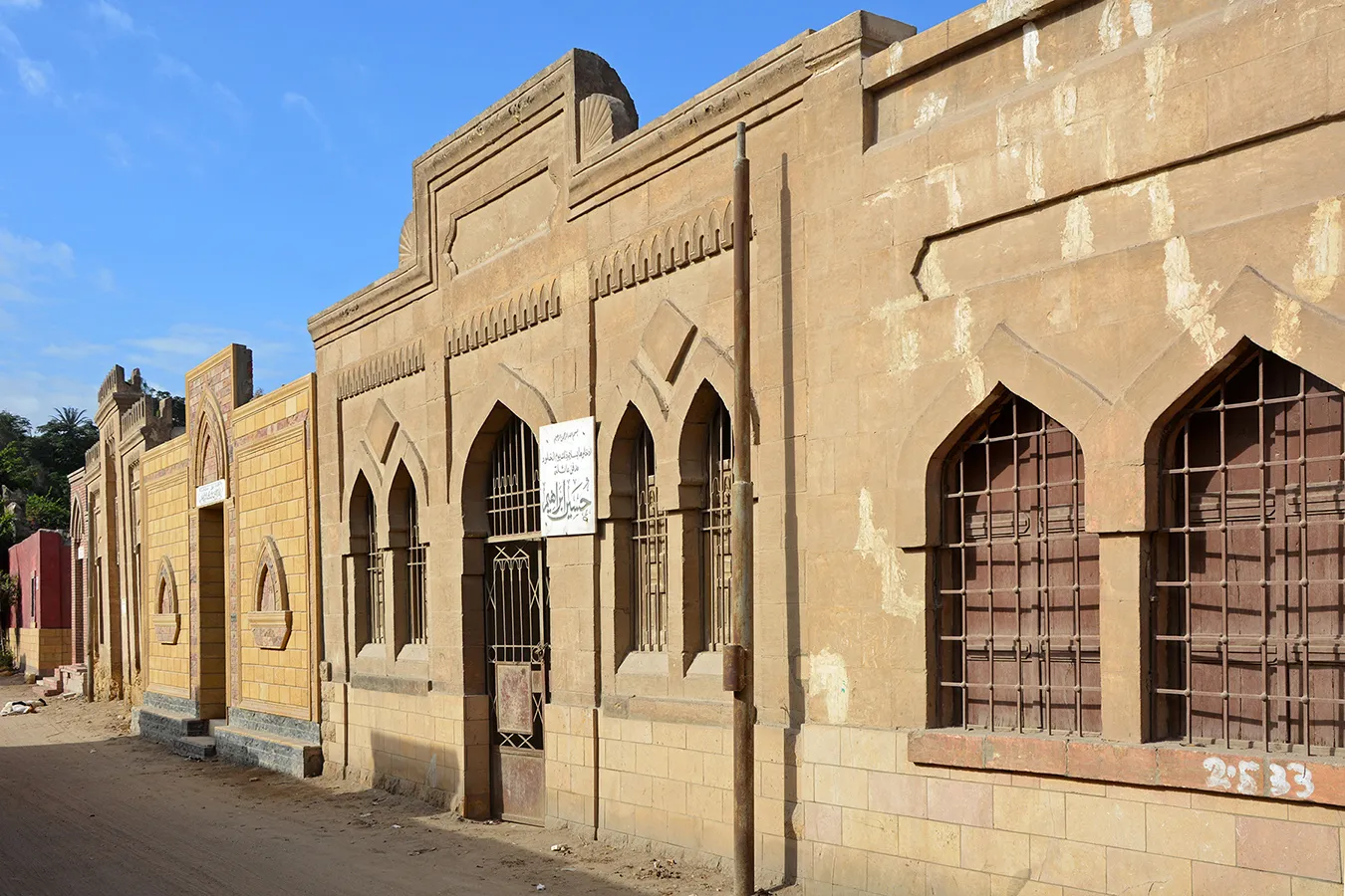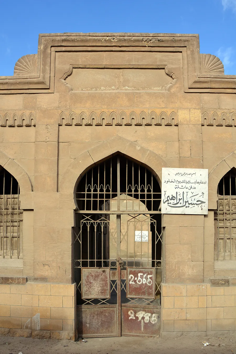 A small roughly rectangular enclosure measuring approximately 17 x 9 metres. It borders on a street to the east, on neighbouring funerary enclosures to northern and southern sides, and on the embankment of the Salah Salem motorway to the back (west). A single-storey structure on an L-shaped plan occupies the eastern part of the lot. The main (eastern) façade is strictly symmetrical, divided into three bays slightly recessed between plain flat projections and topped with a simplified muqarnas frieze. The portion of the façade over the central bay containing the entrance gate is higher, forming a step framed in moulding continuous with cornice, with scalloped quarter-circle ornaments to the sides. In the taller section is an empty recess framed in mouldings like Mamluk-style placement for an inscription panel. The entrance gate and double windows placed in side bays are covered with keel arches of horseshoe profiles that are framed in un-moulded flat projections, which rhombus-shaped projections over the twin windows. It is not clear whether the extreme simplification of opening’s decoration results from modernist aesthetics prevailing at the time of construction, or the planned mouldings were never carved. However, some other elements are finished with fine carving, so it appears that the latter was the case. In the doors and windows are extremely simple openwork grilles of pieces of rolled steel. The windows are fitted with simple panelled wooden shutters with openings of simplified decorative outline above. The entrance leads to an arcade opening on the small back courtyard with arches similar to those in the front façade. To the left (south is the entrance to a room, and further to the west, on the southern side of the courtyard, is another room opening onto the courtyard with two arches.