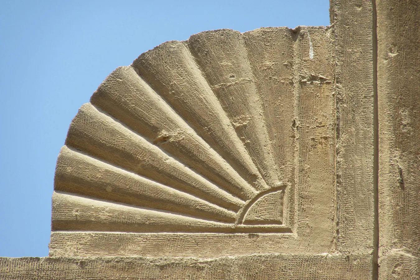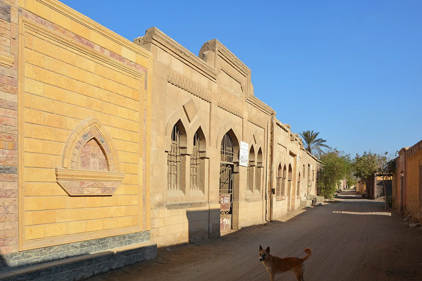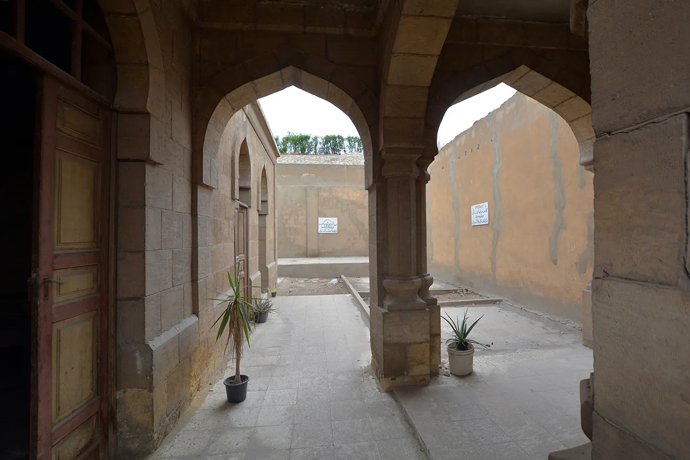 A small roughly rectangular enclosure measuring approximately 17 x 9 metres. It borders on a street to the east, on neighbouring funerary enclosures to northern and southern sides, and on the embankment of the Salah Salem motorway to the back (west). A single-storey structure on an L-shaped plan occupies the eastern part of the lot. The main (eastern) façade is strictly symmetrical, divided into three bays slightly recessed between plain flat projections and topped with a simplified muqarnas frieze. The portion of the façade over the central bay containing the entrance gate is higher, forming a step framed in moulding continuous with cornice, with scalloped quarter-circle ornaments to the sides. In the taller section is an empty recess framed in mouldings like Mamluk-style placement for an inscription panel. The entrance gate and double windows placed in side bays are covered with keel arches of horseshoe profiles that are framed in un-moulded flat projections, which rhombus-shaped projections over the twin windows. It is not clear whether the extreme simplification of opening’s decoration results from modernist aesthetics prevailing at the time of construction, or the planned mouldings were never carved. However, some other elements are finished with fine carving, so it appears that the latter was the case. In the doors and windows are extremely simple openwork grilles of pieces of rolled steel. The windows are fitted with simple panelled wooden shutters with openings of simplified decorative outline above. The entrance leads to an arcade opening on the small back courtyard with arches similar to those in the front façade. To the left (south is the entrance to a room, and further to the west, on the southern side of the courtyard, is another room opening onto the courtyard with two arches.