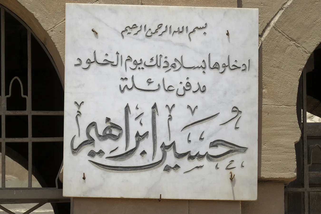 To the right of the entrance door, a large modern marble plaque is mounted with disregard to the architectural divisions of the façade, with an incised inscription that after invoking God’s name invites to enter in peace and security the funerary enclosure of Husayn Ibrahim. There is no date