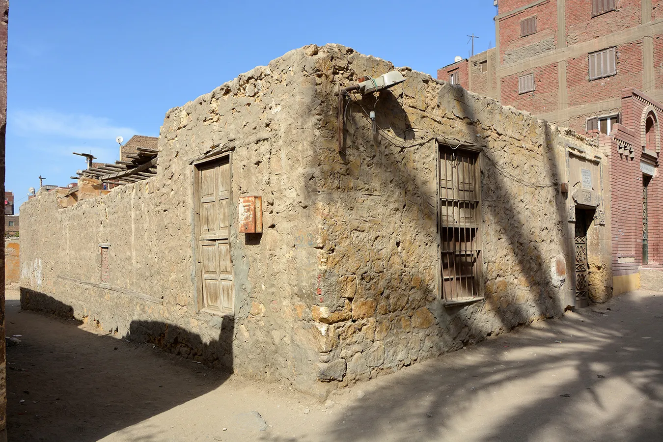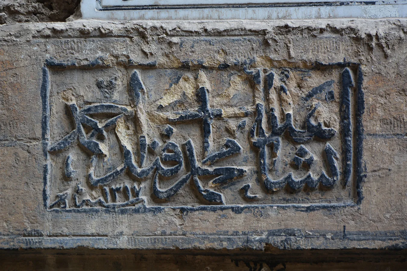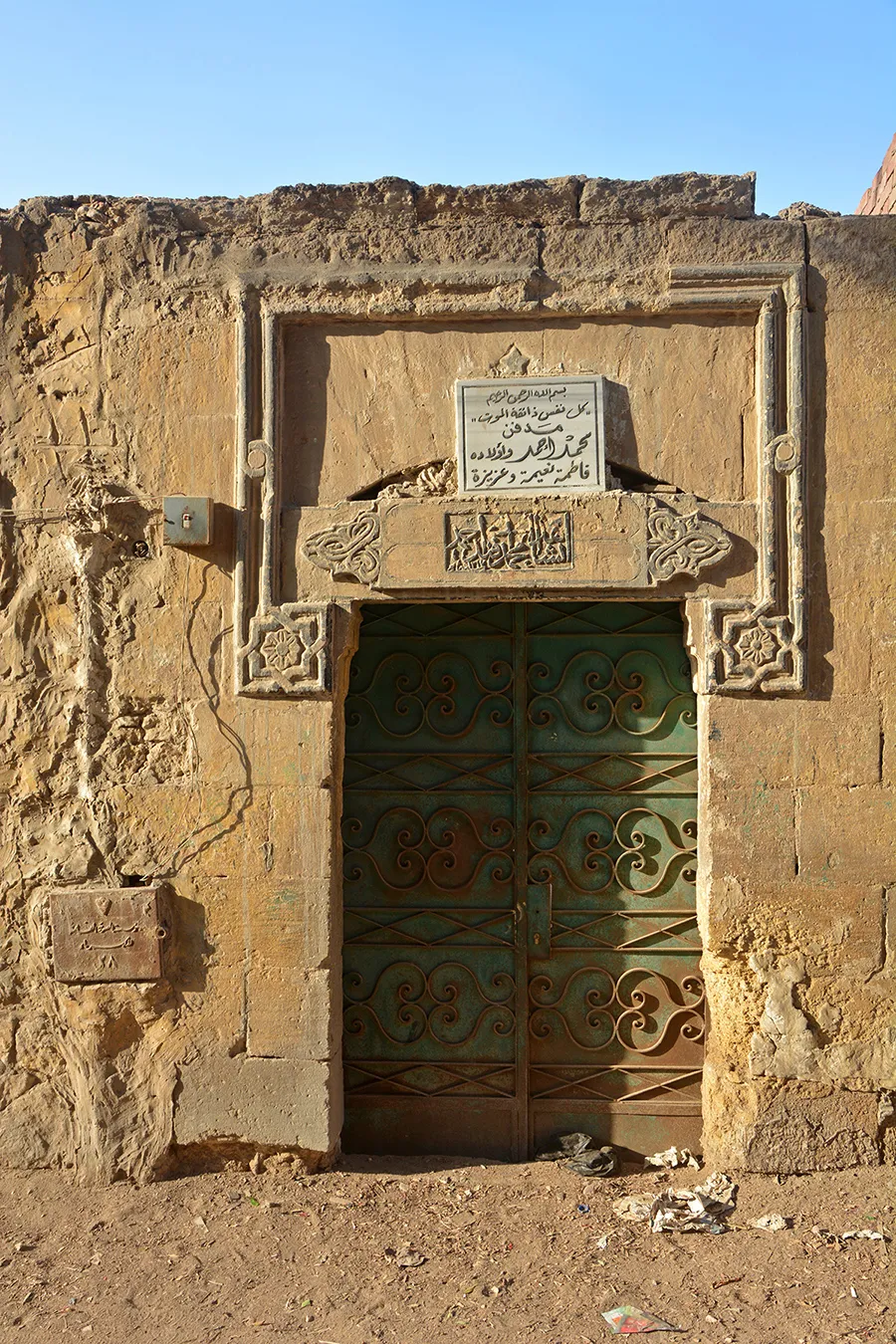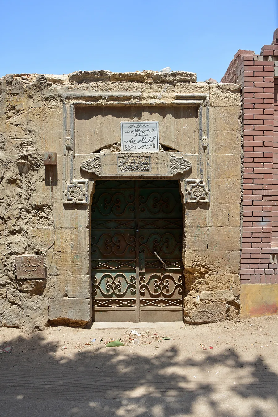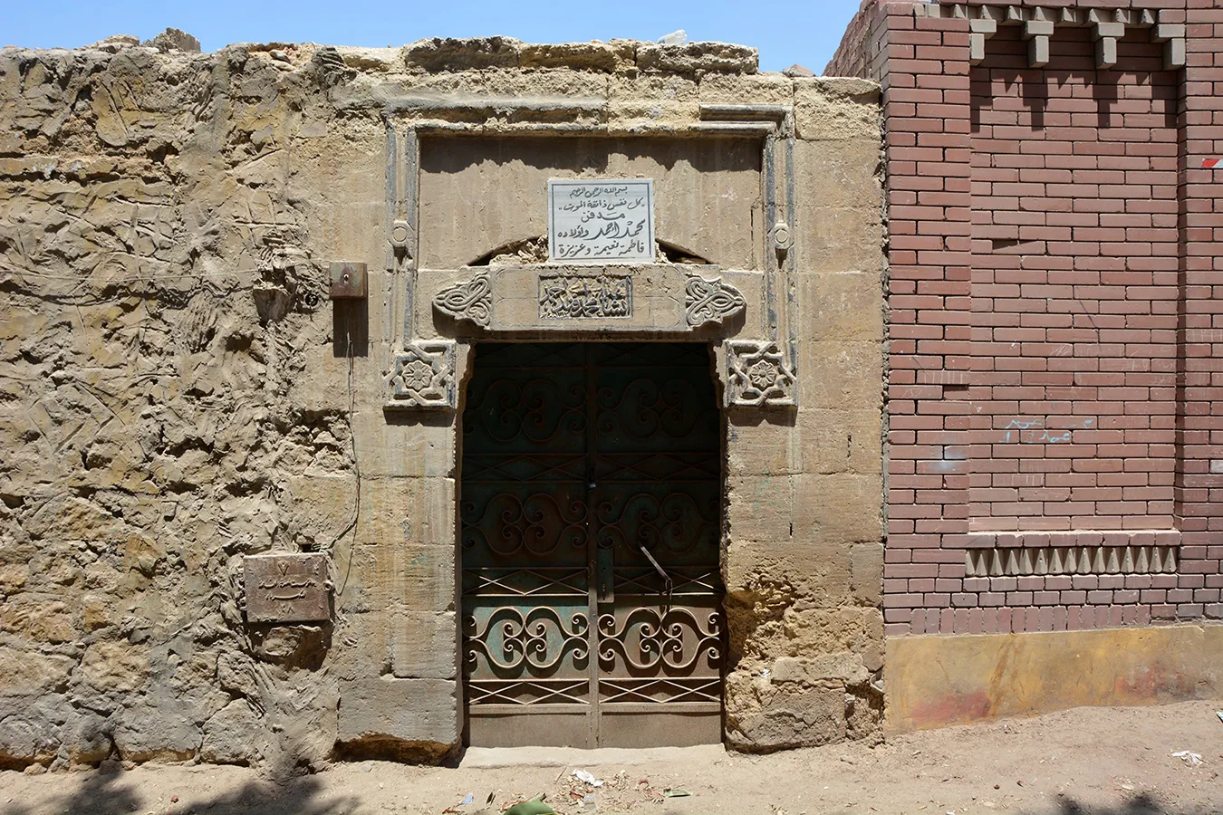 The simple entrance gate is on the eastern side of the southern elevation. It is well-built of ashlar stone. The rectangular door is covered with a monolithic marble lintel, over which is a relieving arch. The lintel and arch are framed in knotted mouldings that end with complex eight-pointed star shapes typical of late-Ottoman period architecture in Cairo. On the lintel is a projecting carved panel with Ottoman-style motifs to the sides, and with a rectangular inscription panel in raised relief carved into it in the middle, giving the name Muhammad Ahmad Effendi and the date AH 1317. The incisions on the panel indicate that it was originally intended to include two lines of inscription in separate round-ended panels, which would give it a more Ottoman-like appearance. On the keystone of the relieving arch is a carved ornament with a five-pointed star at the top. It is obscured by a crudely mounted modern marble panel (undated) with an incised inscription referring to Muhammad Ahmad’s daughters. The steel door leaves are modern.